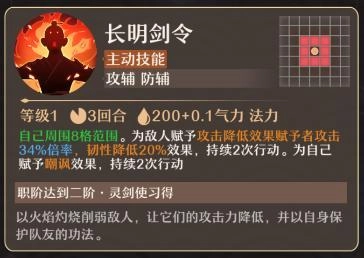 长明剑令(主动技能):以自身为中心的8格范围内,对敌人施加攻击降低(数值为施加者攻击的34%)和韧性降低20%的效果,效果持续2次行动;同时为自身附加嘲讽效果,持续2次行动。