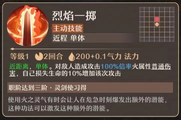烈焰一掷(主动技能):近距离单体技能。对目标敌人造成相当于自身攻击100%倍率的火属性普通伤害,同时自身会损失10%的当前生命值,以此为代价提升该次攻击的效果。