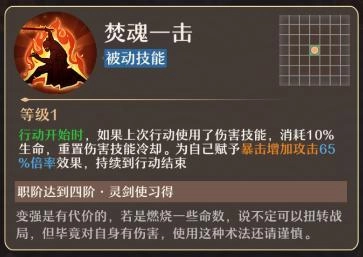 焚魂一击(被动技能):在行动开始的瞬间,若上一次行动释放的是伤害类技能,则消耗自身10%的生命值,将该伤害技能的冷却时间重置。同时,自身获得暴击时攻击倍率提升65%的效果,此效果持续至本次行动结束。