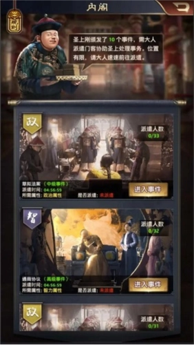 (2)内阁是获取政绩与门客书籍经验的绝佳途径,只需根据事件所需属性,派遣对应属性的门客参与即可。不过参与内阁需消耗虎符(可通过联盟贡献兑换)。