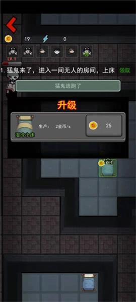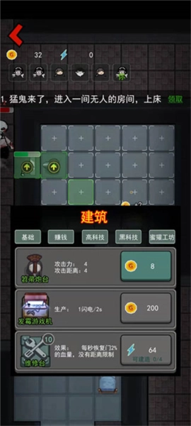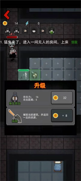 1、升级炮塔以增强你的战斗能力,持续消灭凶鬼,守护宿舍里的人类。