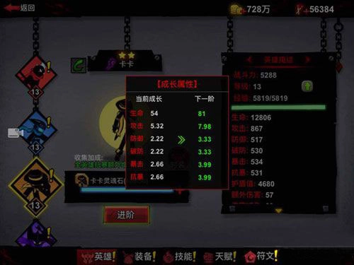 英雄进阶:英雄进阶可以提升英雄的成长属性,即各属性的成长值;