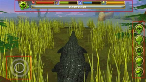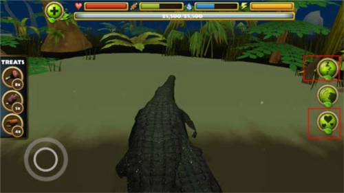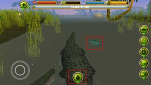 2、当鳄鱼进入水中时,会自动出现一个按钮。你需要通过捕食来补充能量,同时要小心附近其他动物的侵害。