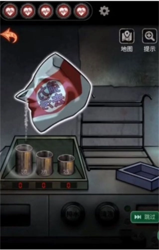 3、先将5克倒入50克中。接着把25克倒入30克的容器,再将30克的容器倒满,之后把30克容器里的东西倒入25克容器,这样就能得到5克。