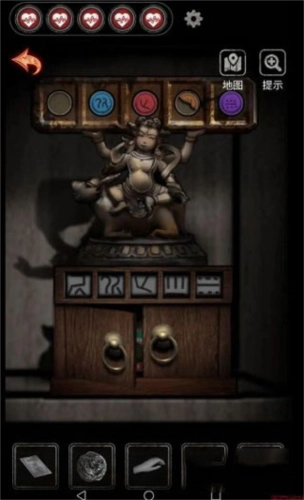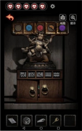 2、2009,年,找到大柜子里的哪吒雕像,把之前找到的两个工艺品放上去,通过结合雕像上的图案就能得到密码。