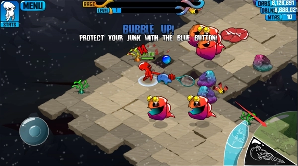 1、每层地牢里都藏着不少模样更怪异的怪物——既不像龙虾也不像螃蟹的那种,它们会吐飞弹、射激光,个个都挺“厉害”。好在我们的“章鱼哥”实力也不含糊。它的武器特别有意思,刚出场时拿着个球拍样的家伙,之后每下一层地牢,还会冒出更多奇奇怪怪的武器:棒槌、剪刀、骨棒、镰刀,甚至还有一根长得像“金箍棒”的棍状玩意儿……各种离谱的东西,让人忍俊不禁。当传送口亮起,就说明玩家能进入下一层地牢了。不过建议别着急进去,先在当前层强化武器、提升自己。随着关卡推进,会遇到越来越多强力怪物,要是没有好的道具和装备加持,很容易就被击败。