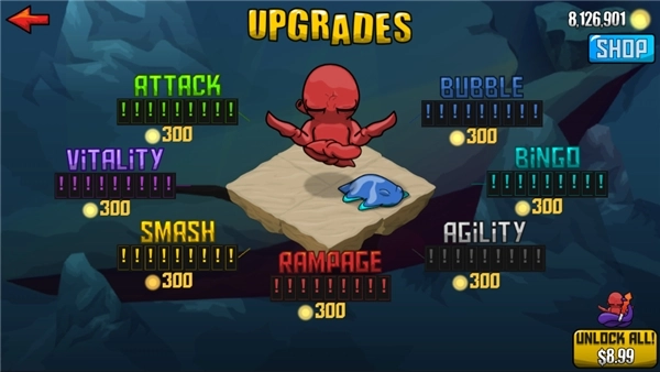 4、狂暴魔法人里设有完善的升级系统与技能系统,玩家能按照自己的偏好改造小魔法人Quadropus,不管是手枪还是魔法棒,章鱼哥施展的都是极具冲击力的近身物理攻击。