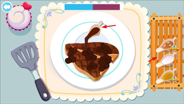 6、牛排煎制完成后盛入餐盘,点击右侧的酱汁选项,为牛排增添风味