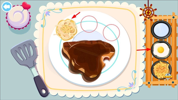 7、当牛排淋好酱汁后,玩家需要依据客人的具体需求,从右侧选择对应的配餐添加到餐盘之中。