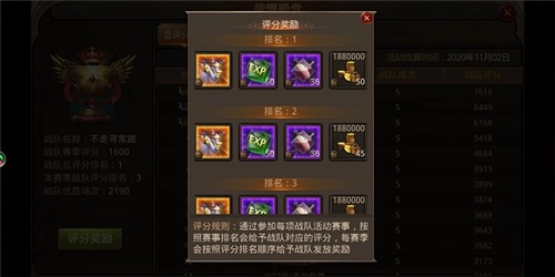 荣耀殿堂:勇士们参与各项战队活动赛事,系统会依据赛事排名给予战队相应评分;每个赛季,系统将根据评分排名为战队发放奖励,其中前三名的奖励里还包含华丽的坐骑时装呢!
