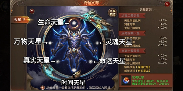 当六颗天星全部点亮后,就能解锁名为【奇幻星龙】的炫酷外观,以及强力技能【龙魂吐息】。该技能的效果为:当生命值低于20%时,将有3%的几率触发,使生命值恢复至80%,且技能冷却时间为60秒。