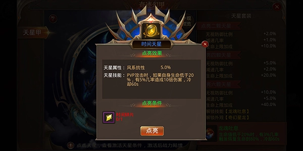 天星技能:在PVP战斗中,当自身生命值低于20%时,有5%的概率触发10倍伤害效果,该技能的冷却时间为60秒。