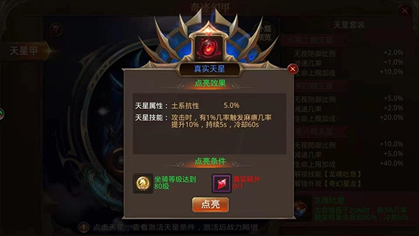 点亮真实天星的条件是坐骑等级需达到80级,并且获取一个真实碎片,满足这两个条件后即可点亮真实天星。