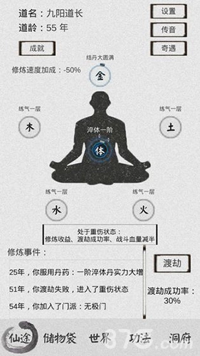 炼气期开放的功能不多,不过玩家在这个阶段停留的时间也比较短。装备上初始功法(无名功法:金)后,会自动获取修为值,等修为槽填满了,才能点击下方的按钮进行渡劫(也就是境界突破)。