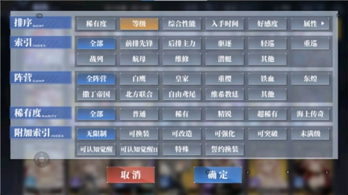 点击“筛选”可以看到各阵营舰种的分类。