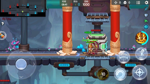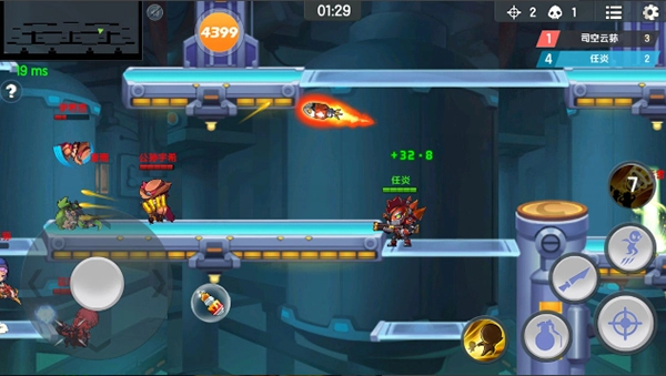 在战斗过程里,我们总共有六个按键,分别对应着手雷、跳跃、开火、闪现、大招和近战攻击这几项功能。在游戏中,我们能清晰看到自己和敌人的血条,人物移动十分频繁,我们要做的就是在最短时间内消灭尽可能多的对手。