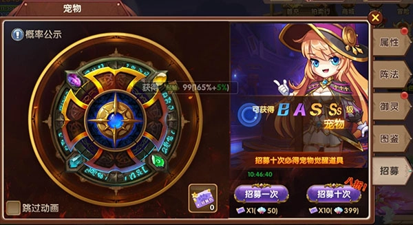 2.进入宠物招募界面后,记得勾选血统检验!(听说就算是运气不太好的玩家,一次十连抽也能至少获得2个SS级宠物呢)