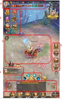 ①:玩家信息区域,涵盖玩家等级、生命值、战斗力、游戏币、钻石数值等内容;