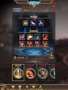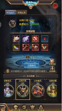 进入BOSS挑战有机会随机获取各类珍稀装备,BOSS的等级越高,能得到的奖励就越丰厚;每天拥有3次BOSS挑战疲劳次数,第二天会重置;另外还能查看其他玩家在世界频道展示的珍稀装备掉落情况。