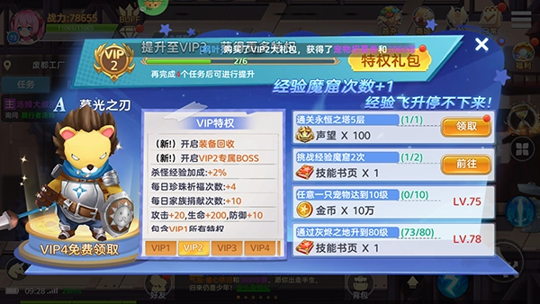 2、VIPBOSS:玩家达到40级后,可通过完成VIP任务领取VIP资格并解锁VIPBOSS。这些BOSS虽为低阶,但挑战后仍能获得相应的奖励与经验。