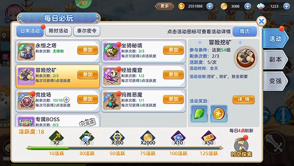 3、日常任务方面,冒险挖矿和经验魔窟会在玩家达到54级和65级时分别解锁,这两个玩法不仅充满了随机性与趣味性,还是玩家获取经验值和各类奖励的重要途径。