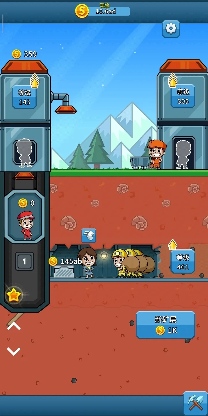 3、当等级提升到5级时,玩家就能雇佣经理了,包括矿区经理、电梯经理和地面经理,每个都需要100金币。经理的功能是持续监督工人作业,这样玩家就不用一直手动点击工人干活,即便挂机,工人们也会自动进行工作。随着矿区2的开采推进,经理的雇佣费用也会随之上涨。当矿屋1的等级达到10级时,地下矿场里会出现两名穿黄色衣服的矿工,他们每次能挖掘价值94个金币的矿石。