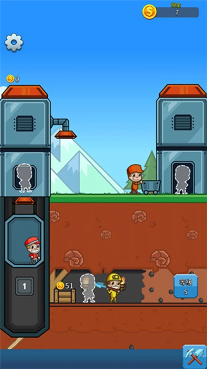 4、电梯运输与地面运输工的升级需消耗480个金币,升级后可提升运输速度、运输量及运输工人数等属性。玩家攒足金币后即可启动升级流程。当经理头顶出现小锤子图标时,点击该图标可对采矿的矿工进行加速,不过加速时长仅为60秒。黄色矿工的箱子、电梯以及地面推小车的矿工,各自的最大金币装载量均为1k。