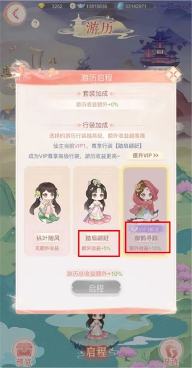 仙主大人挑选好游历行装后,就能开启游历之旅啦。行装的等级越高,游历能拿到的奖励就越丰厚。要是达到VIP1,就能享受行装【踏扇翩跹】带来的额外收益+5%;达到VIP3的话,还能尊享行装【御鹤寻踪】的额外收益+10%呢!小仙建议仙主大人最好先解锁VIP权益,再选最高级的行装去游历,这样收益才是最可观的哦!