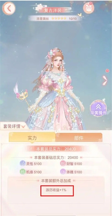 特定的套装也能提升游历收益呢!那有哪些套装可以增加游历加成呀?据了解,目前能提升加成的套装只有一套:复古洋装-洛里薇丝,这套装备能在游历行装的基础收益加成之上,再额外获得1%的收益加成,仙主大人要是对这套套装进行注灵或者升阶,额外收益的加成也会跟着不断提高哦!