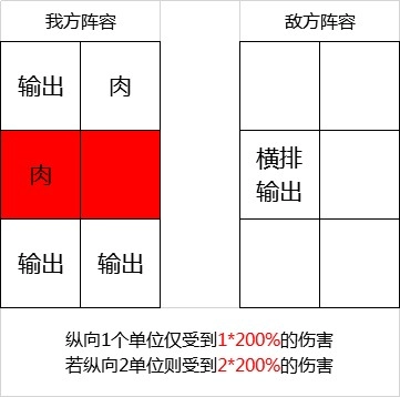 保持纵向仅存在一个单位时,该单位仅承受200%的伤害;若纵向有两个单位,则会受到2×200%=400%的伤害。反过来,当我们作为攻击方时,也可以尽量让横向输出的英雄同时攻击到两个敌方单位。