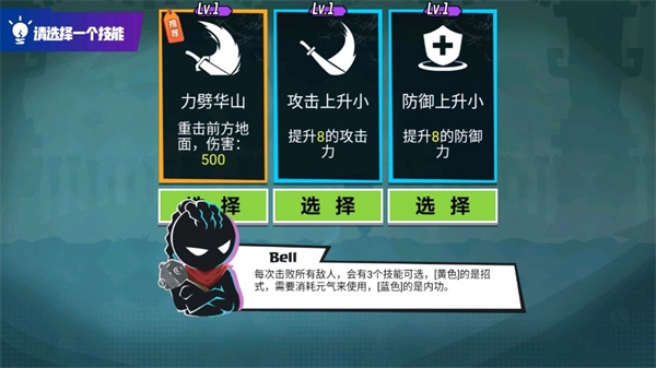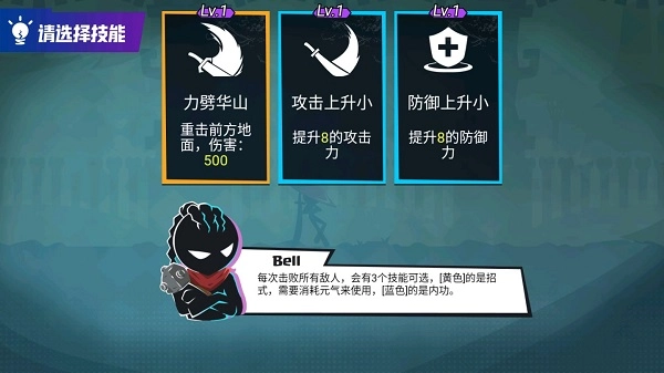 3、之后,每当击败所有敌人,会出现三种技能供选择:【黄色】为招式,使用时需消耗元气;【蓝色】则是内功。