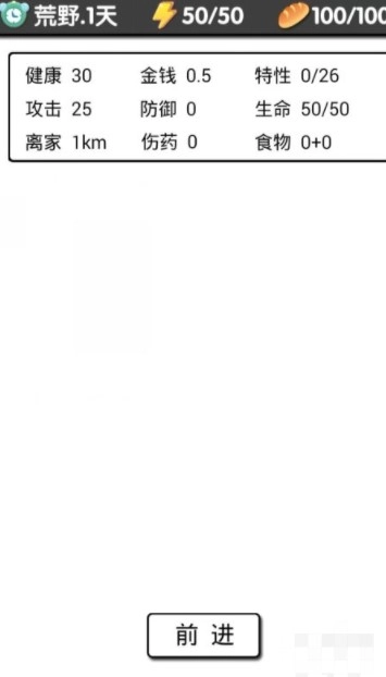4、选定愣头青后,就正式开启流程了。点击“前进”,前进和探索操作都会消耗精力,精力可通过睡觉或喝啤酒恢复(啤酒需等你抵达县城后才能获得)。