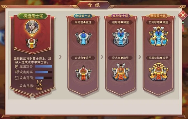 这里面包含箭塔、策士塔、步兵塔和炮塔这四种防御塔类型,它们都支持升级操作。其中,中级、高级、顶级这三个升级阶段,分别需要在武将等级达到10级、30级、45级时才能解锁晋级。一旦完成升级,防御塔的攻击伤害与攻击范围都会相应提升。