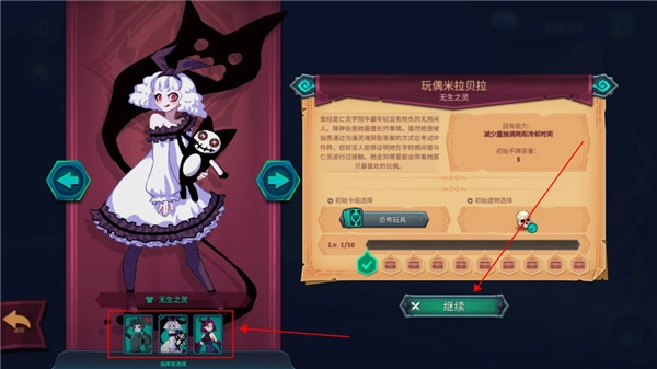 2、随后玩家可从三位角色中进行选择,若角色显示锁定状态,可前往商店使用钻石解锁购买;选定角色后点击“继续”即可开始游戏。