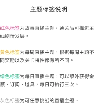 红色标签关联着主线剧情,新主播们将在欧伏来王国慢慢感受成长的喜悦,完成一场场挑战与历练。完成主线能得到丰厚的奖励,在触发特定事件后还能解锁支线直播。