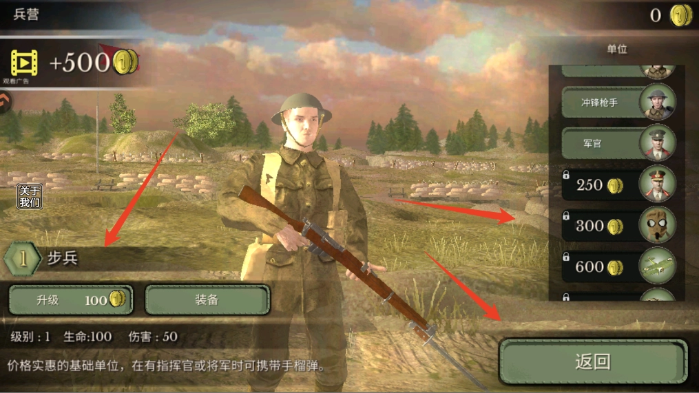 5、支持关卡选择,需先通关关卡1才能解锁后续关卡,进入关卡前可点击兵营进行兵种管理。