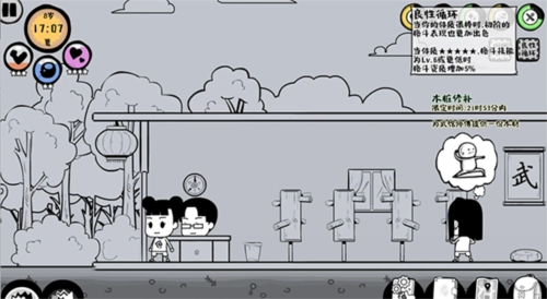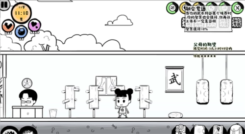 第四个buff是“良性循环”,当角色有钱去武馆且格斗资质未达满星时必定触发——毕竟技能都还没学呢。这个buff的效果是让格斗资质提升5%。