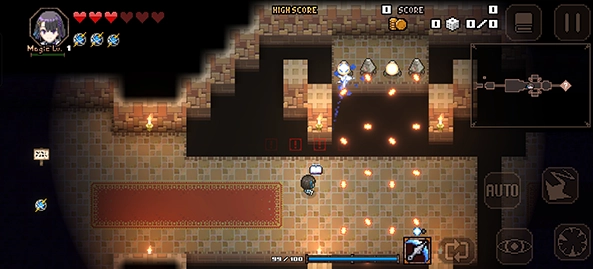 这是一款弹幕射击游戏,玩家通过左摇杆控制移动,右摇杆进行瞄准。每次进入游戏,玩家都会面对随机生成布局的地下城,开启一场全新的冒险。