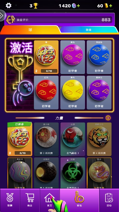 8、点击下方的“背包”按钮,能够随时更换球具或者调整当前正在使用的装备。