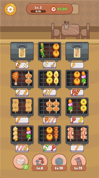 2、调整位置:要仔细留意烤架上烤串的烤制情况、食材组合、摆放位置等相关状况,依据实际情形选用横向调整、纵向调整或跨烤架调整等恰当方式;经过反复尝试与调试,慢慢探寻出可提高烤制效率、降低失误的最佳布局方法,为后续顺利通关做好准备。