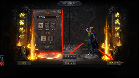 3、进入人物选择界面后,点击“创建人物”选项,完成“姓名”“职业”“性别”的设置,再点击“进入”,小号即可创建完成。