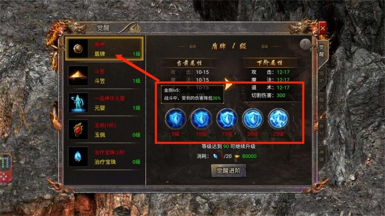 2、大家佩戴盾牌后,能获得大量防御与魔防属性加成,同时也会有少量攻击、魔法、道术属性提升。若对盾牌进行觉醒,还可解锁金刚效果,在战斗中降低一定比例的所受伤害。此外,当盾牌与斗笠的等级达到指定要求时,就能激活套装效果,获得增加攻击伤害、减少物理伤害和魔法伤害的加成。