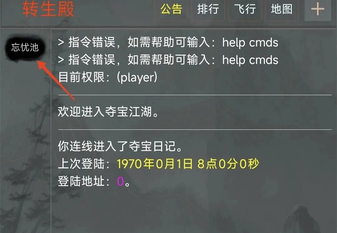 设置好参数后,从新手广场出发,向西走一步,就能到达江湖聚义厅;再往南走一步,即可抵达冥思房。