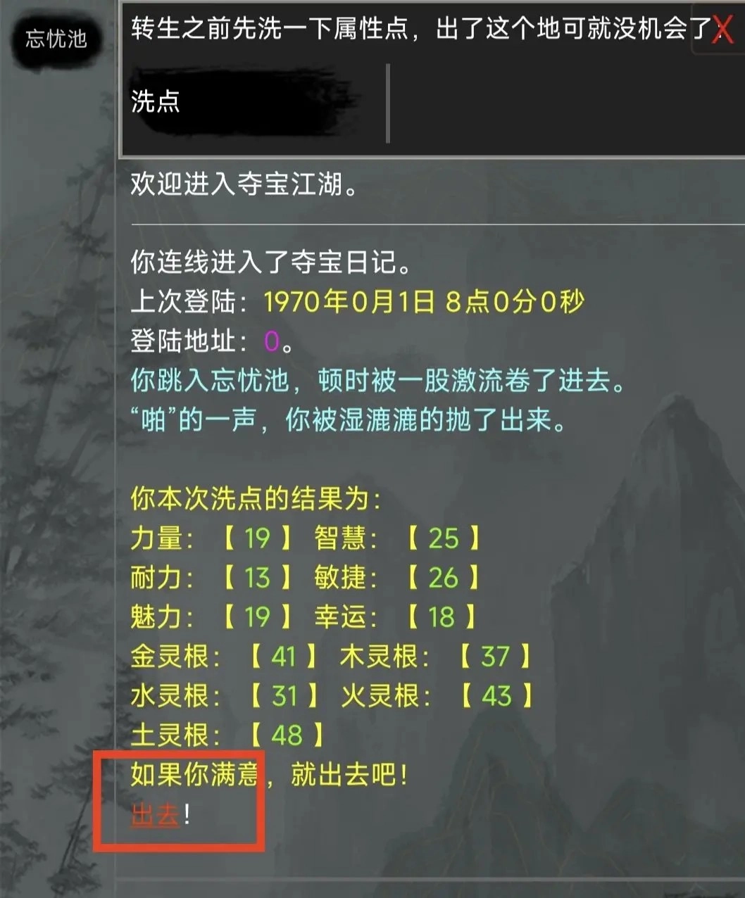 刷出满意的属性后,点击属性下方标红的“出去”字样,就能踏入夺宝江湖了。