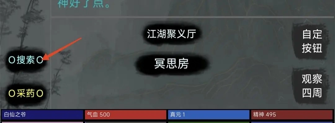 冥思房的左下角设有两个功能选项,分别是“搜索”和“采药”。当点击“搜索”选项时,玩家可以获取到多种适合新手的武学书籍,以及用于提升技能等级的相关物品。