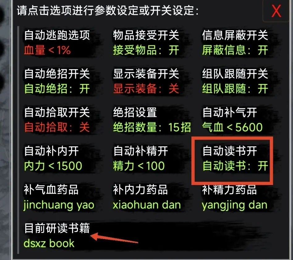 拿到书籍(物品)后,再次点击「常用」「综合属性」「参数设置」,开启自动读书功能,接着选择当前研究的书籍并指定要阅读的基础武学,角色就会自动开始阅读了。