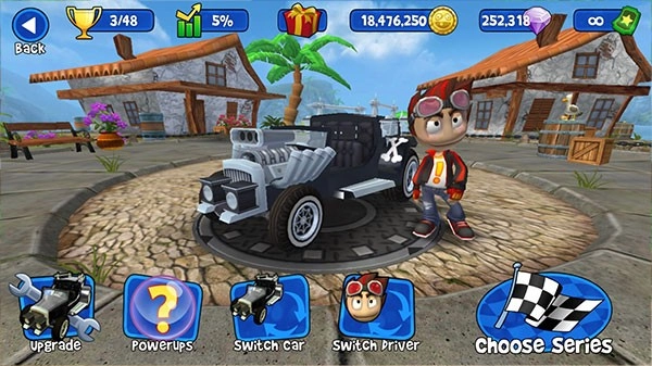 2、底部菜单的第一个选项是“修理”,可用于对赛车的性能进行升级优化;第二个是“无敌状态”,开启后赛车不会受到伤害;第三个是“选择车型”,能挑选自己喜欢的赛车型号;第四个是“人物选择”,不同的人物角色对应不同的特技,可在赛场上使用。之后点击“Choose Series”即可选择关卡。