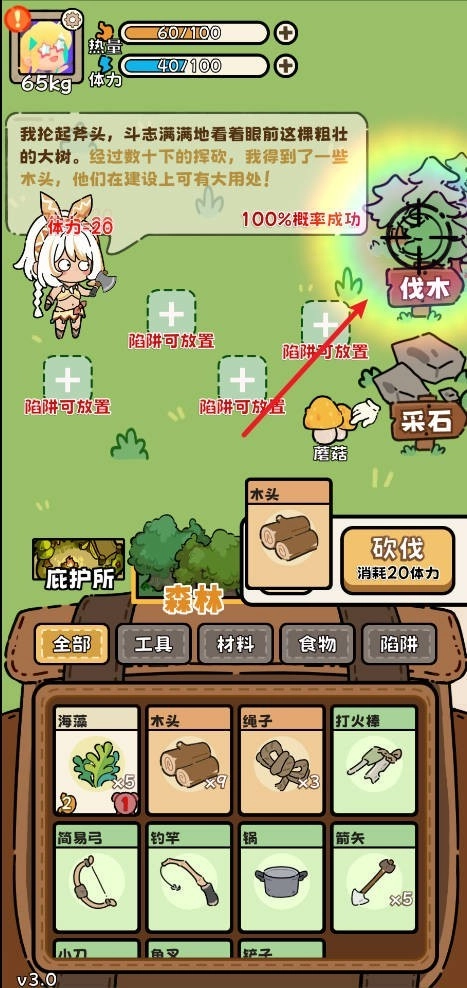 4、前期开局状况不佳,而且没拿到树脂(能让添加柴火的时间翻倍)这个道具,得砍70到75棵树来碰运气找大冰块(要是选了冰箱,并且前十五天打到了不少熊或者海豹,那就不用管这一条)