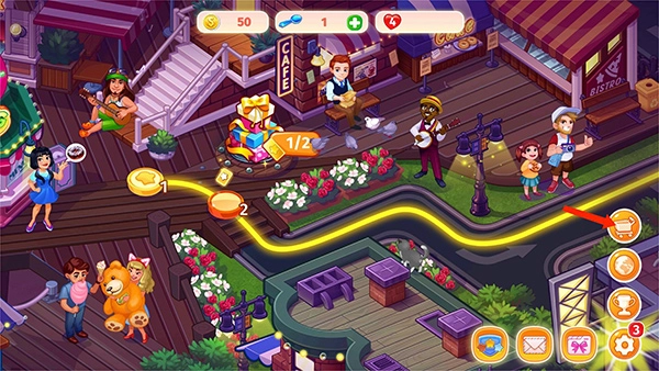 12、点击【信封】图标,即可对全套组合、装饰、效果、大厨服饰以及顾客装饰进行设置,以上便是疯狂大厨的玩法介绍。