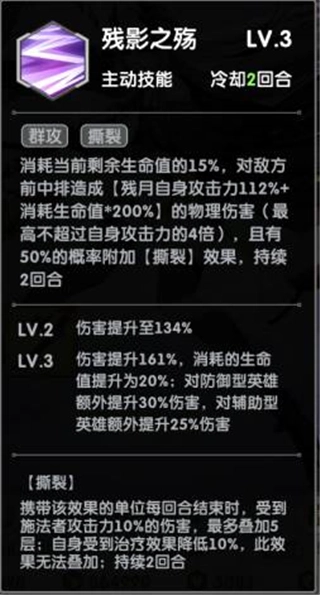 一技能:残影之殇。当技能升至满级时,会消耗自身当前20%的生命值,对敌方前中排英雄造成相当于自身攻击力161%加上所消耗生命值200%的伤害,不过该伤害有上限,最高不超过自身攻击力的4倍。此外,对防御型英雄会额外提升30%伤害,对辅助型英雄额外提升25%伤害,同时有50%的概率附加撕裂效果。这个技能可以看作是月河一技能的进阶版本,要是和碧荷的一技能搭配使用,就能实现对敌方全体的打击,而且伤害非常高。